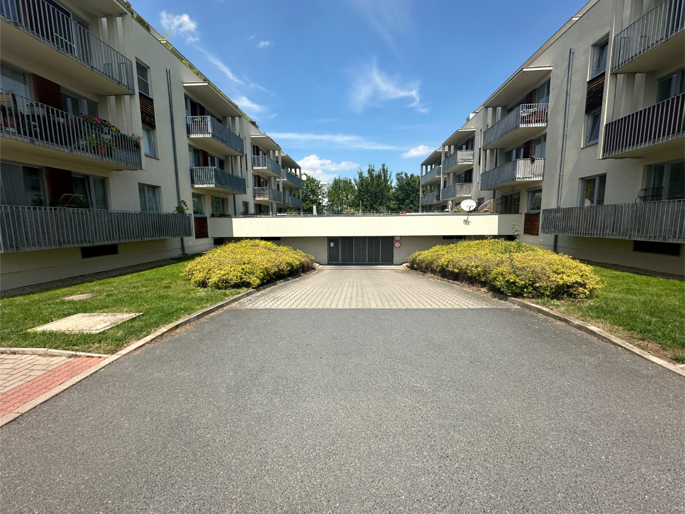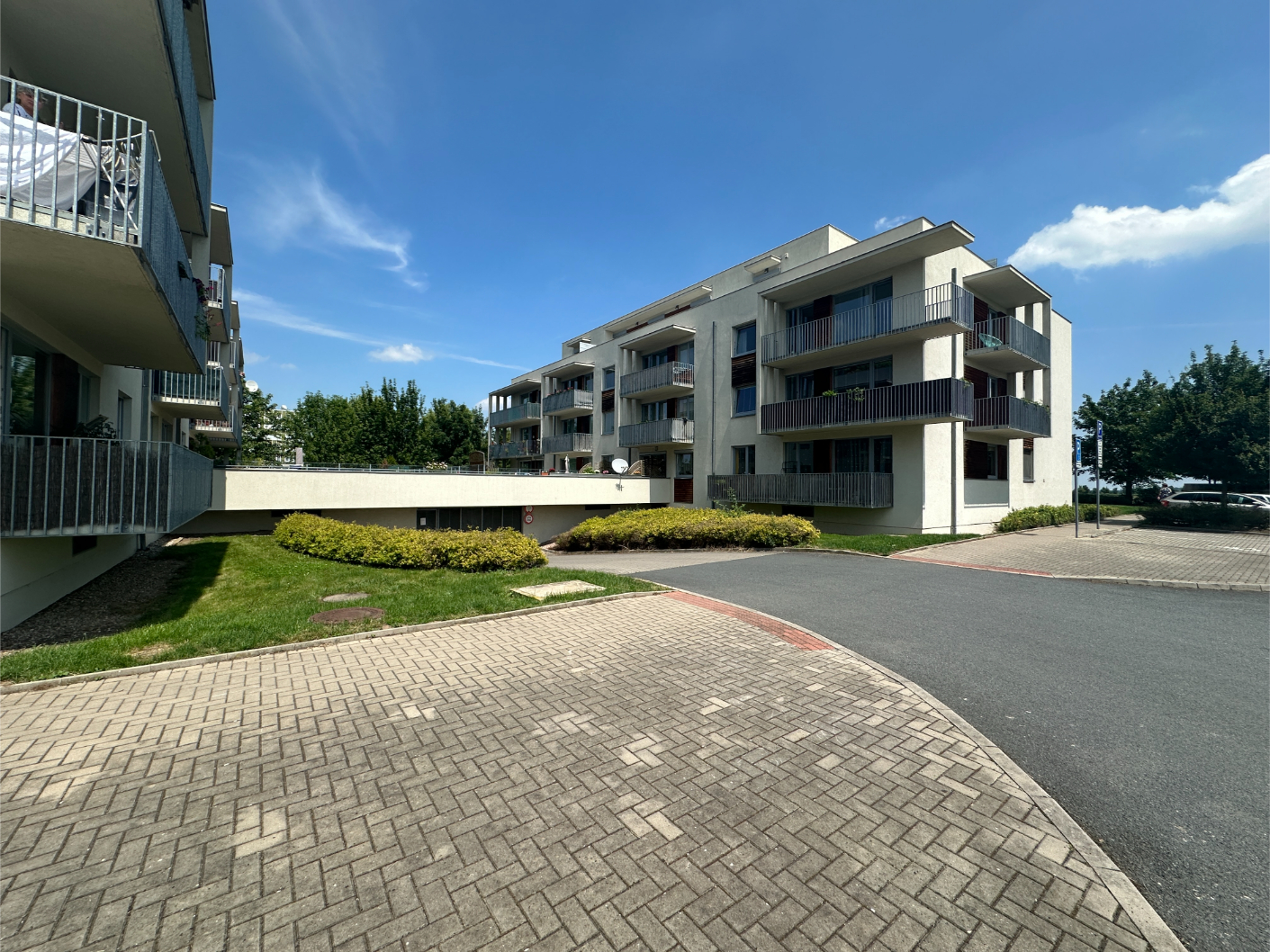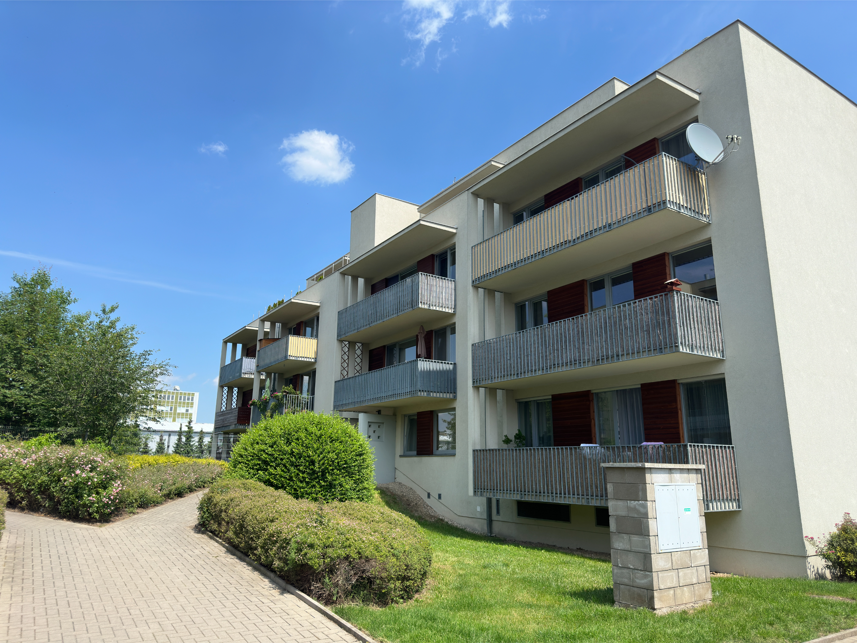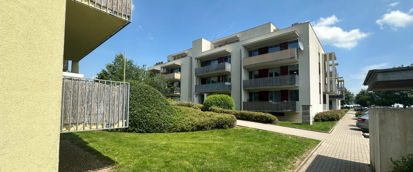 Very nice apartment 2+kk/covered garage in a very quiet location of Prague 9 - Čakovic, Rýnská street. A spacious new building with a floor area of 70.54m2 (apartment 62.95m2 + balcony 7.59m2 and a cellar), is located on the 1st floor of a brick house from 2010. Laminat floors.Fully furnished. Bathroom and toilet with tiles. Kitchen with glass ceramic hob and electric oven, dishwasher, fridge and hood. West-facing balcony.