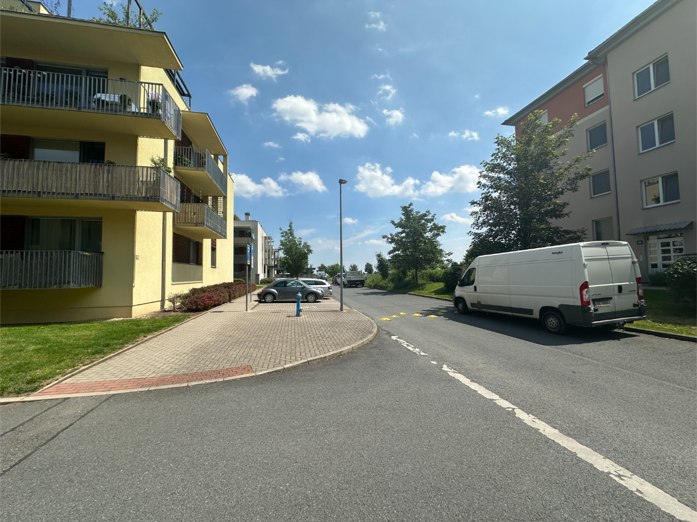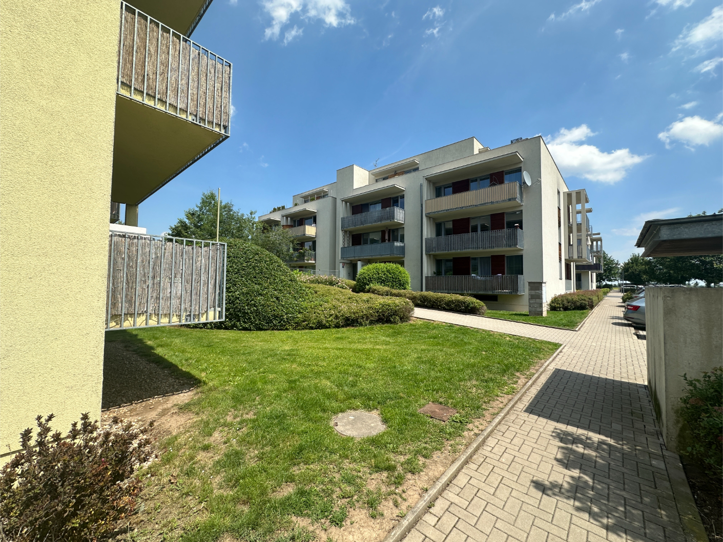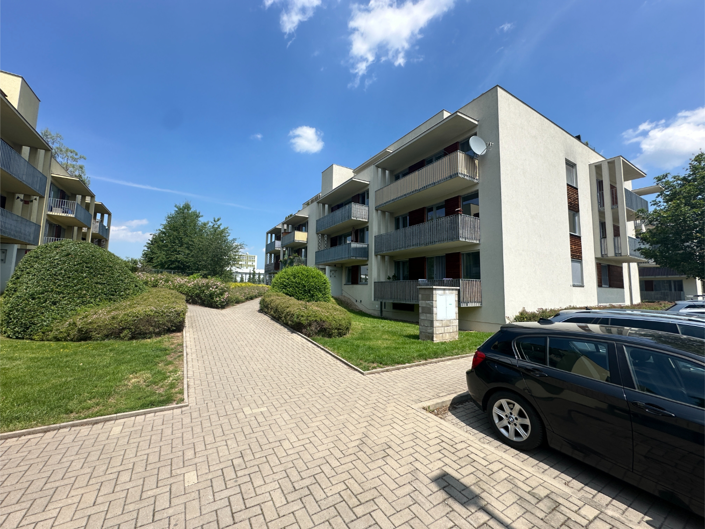 Very nice apartment 2+kk/covered garage in a very quiet location of Prague 9 - Čakovic, Rýnská street. A spacious new building with a floor area of 70.54m2 (apartment 62.95m2 + balcony 7.59m2 and a cellar), is located on the 1st floor of a brick house from 2010. Laminat floors.Fully furnished. Bathroom and toilet with tiles. Kitchen with glass ceramic hob and electric oven, dishwasher, fridge and hood. West-facing balcony.